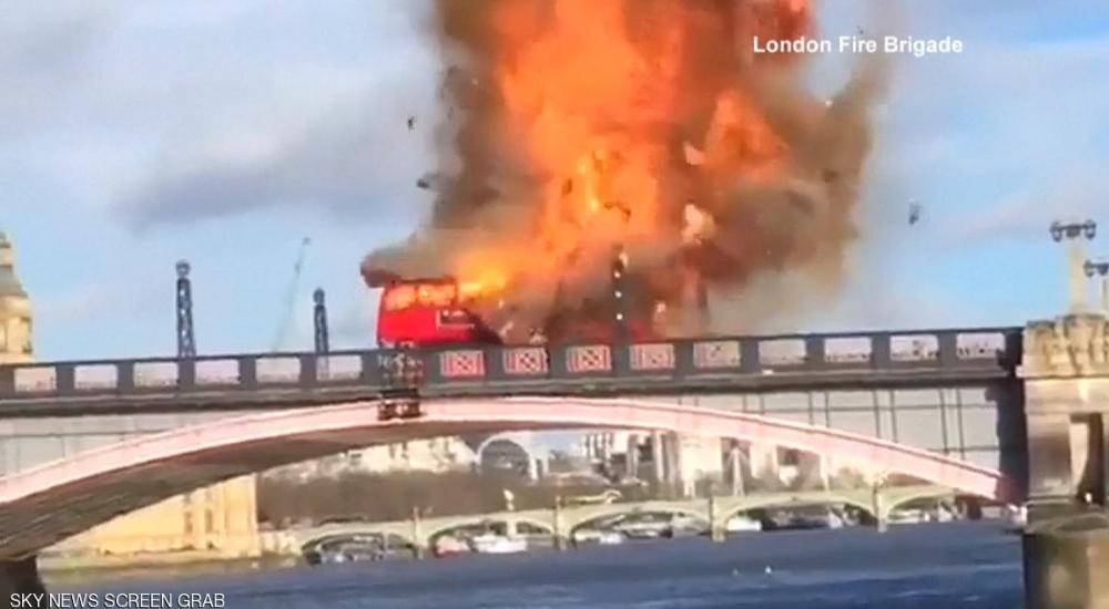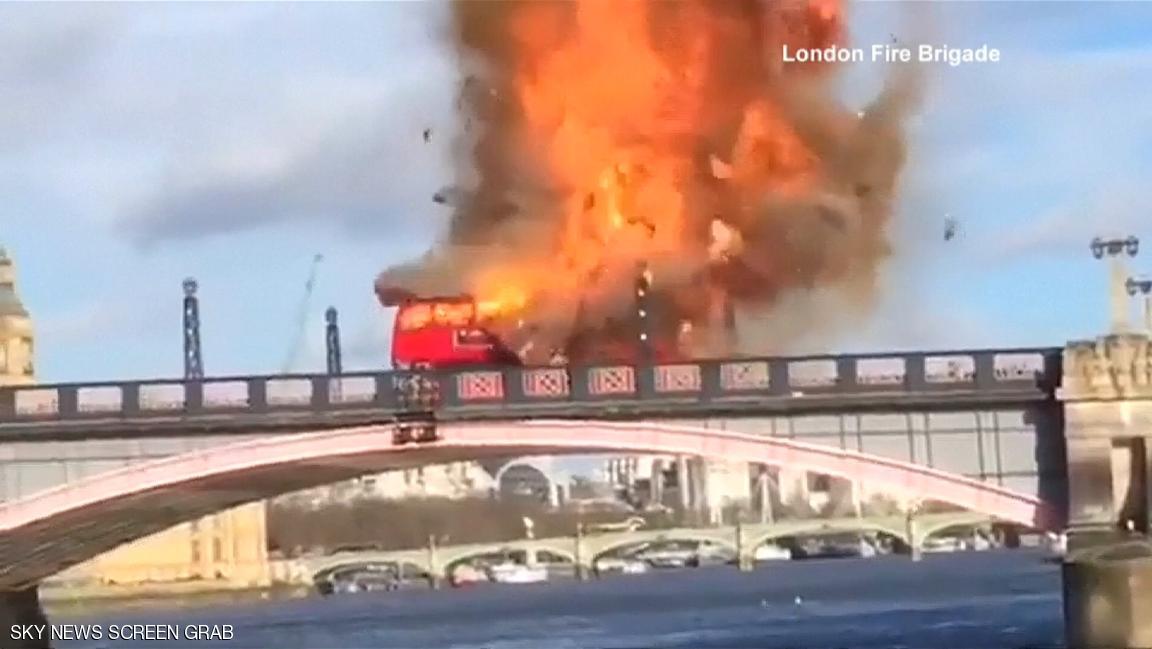 وأظهرت لقطات مصورة نشرت على مواقع التواصل الاجتماعي لحظة تفجير الباص على جسر لامبث فوق نهر التِيمز، واندلاع النيران في هيكله.