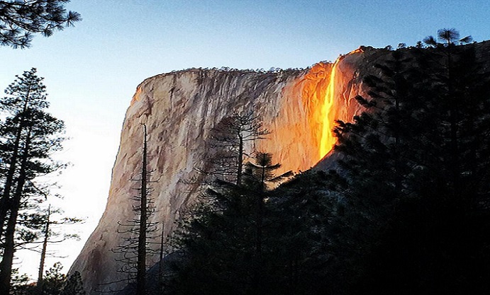 الظاهرة تجددت يوم 15 فبراير الجاري فجأة، وبعد غياب طال سنوات، ظهر الشلال المنهمر من قمة صخرية اسمها El Capitán بالإسبانية، وهي في جبال "سييرا نيفادا" الفاصلة بين ولايتي كاليفورنيا ونيفادا، ويعد عجيبة طبيعية، من نار، وهي ليست من نار ، بل ناتج عن خداع بصري تمارسه الطبيعة أحيانا وفجأة في لحظات سريعة من آخر أسبوعين في فبراير فقط، وضمن شروط فلكية وجيولوجية نادرة الحدوث أيضا.