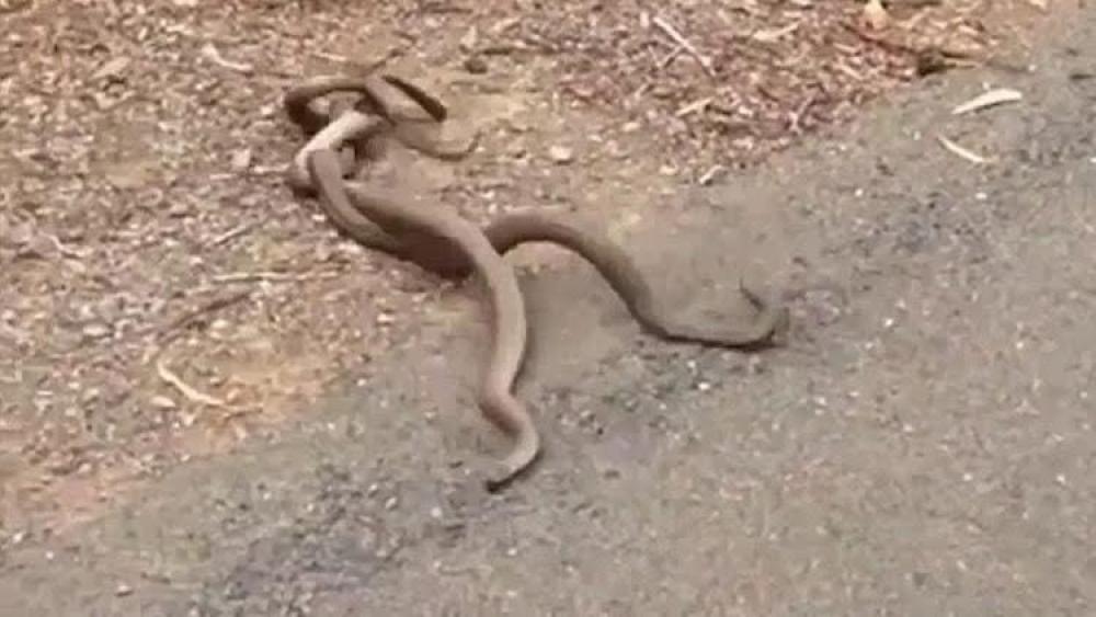التقط ناشط فيديو لاثنين من الثعابين البنية اللون، وهما في وضعية التفاف واشتباك في معركة واضح أنها للحصول على قلب أنثى ثعبان كانت تراقب تطورات العراك.