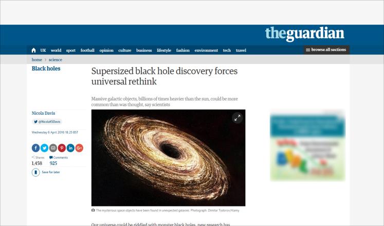 وتوصلوا إلى أن أجسامًا مجرية عملاقة أثقل مليارات المرات من الشمس قد تكون شائعة ومنتشرة في الكون أكثر مما كان متوقعا، ويعد الثقب الأسود عملاقا إذا كانت كتلته ضعف كتلة الشمس بملايين أو مليارات المرات.
