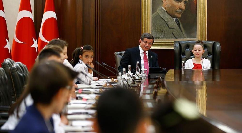 تنحى رئيس الوزراء التركي أحمد داود أوغلو السبت، عن منصبه للطفلة ريحان نور أونلو، التي جلست على كرسيّه، وافتتحت اجتماع المجلس، موضحةً أنّ محور النقاش سيتمركز حول عيد السيادة الوطنية والطفولة.