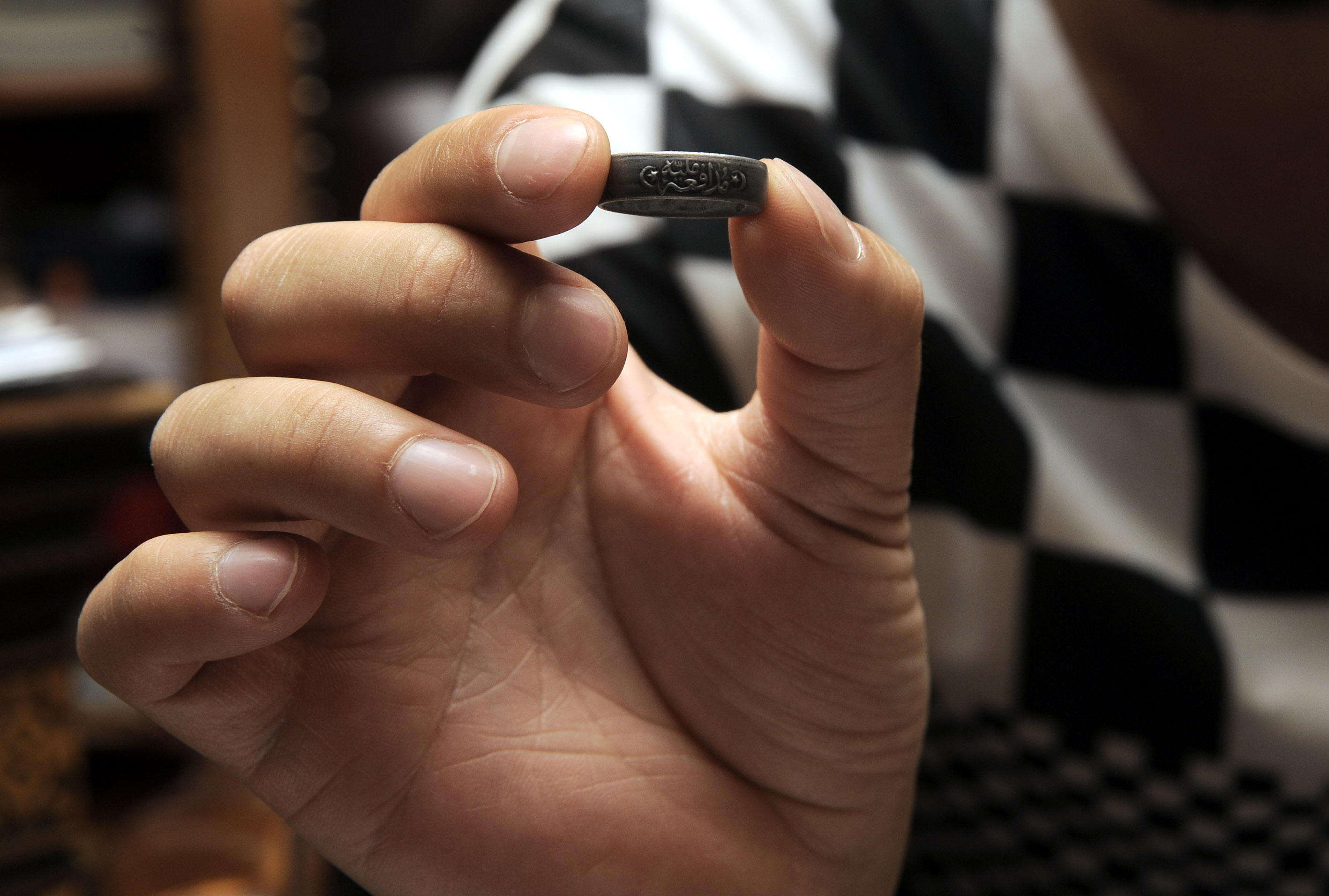 يعرض المواطن التركي أحمد أوصلو في متحفه الخاص في مدينة جناق قلعة التركية، أحد الخواتم النادرة المتبقية من "خواتم الجهادية" التي صُنعت من فوهات بنادق الإنجليز التي غنمها العثمانيون في معركة جناق قلعة عام 1915.
