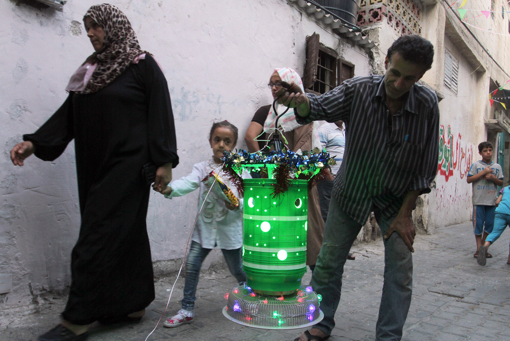أما عبد الله جاد الله "52عامًا" فميز زقاق الطريق المؤدي لمنزله، والذي لا يزيد عرضه عن مترين، بخمسة فوانيس علقها أعلاه، صنعها من مُخلفات أغطية المراوح، والغسالات والكرتون، وقصها بطريقة فنية، ووضع إنارة بداخلها.