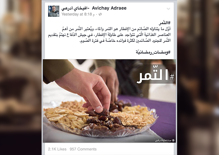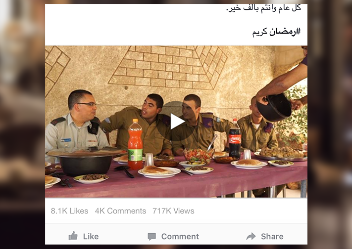 وفي فيديو أخر ظهر أدرعي برفقة عدد من جنود الاحتلال، وكتب معلقًا: "بعد الإفطار وقبل #باب_الحارة (رغم تبديل معتز) لِيكم تحية خاصة مني ومن جنود الجيش، كل عام وأنتم بألف خير".