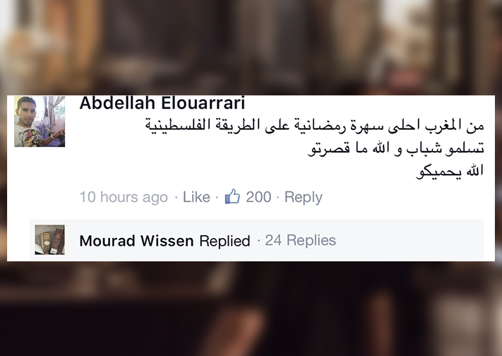 وقال الناشط عبد الرحمن العوراري في تعليقه على منشور أدرعي: "من المغرب أحلى سهرة رمضانية على الطريقة الفلسطينية، تسلمو شباب والله ما قصرتوا الله يحميكوا".