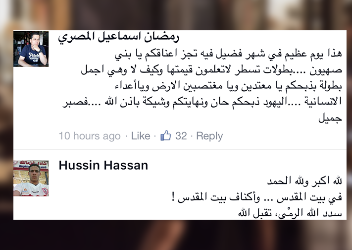 كما قال الناشط مهدي صقر "هنيئًا لمنفذي عملية #باب_ الحارة بكل دعوة فاضلة من قلب مسلم، وربنا ما يشمت فيكم اليهود ولا أفيخاي أبو ذراع".