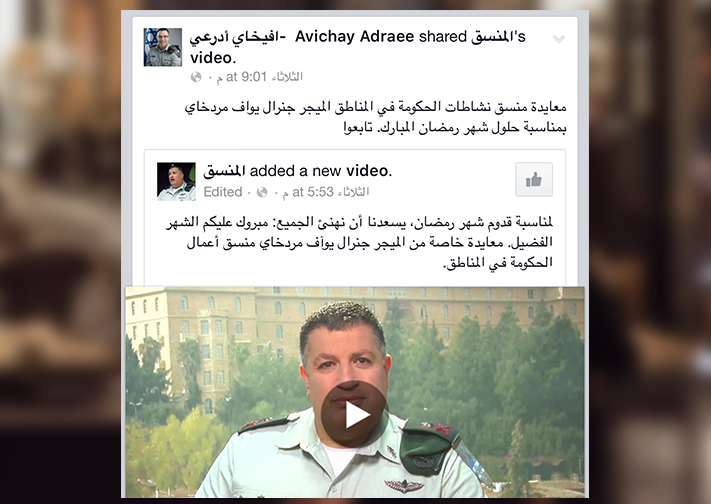 ونشر أدرعي عبر فيسبوك فيديو لمنسق أعمال حكومة الاحتلال في المناطق المحتلة الميجر جنرال يواف مردخاي، "يهنئ فيها المسلمين بمناسبة حلول شهر رمضان المبارك"، ويقول إنه: "سيحضر مسلسل باب الحارة".