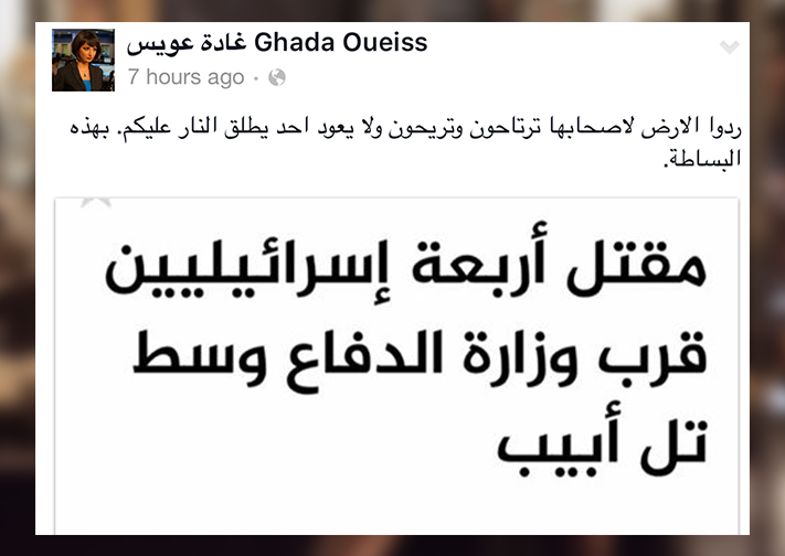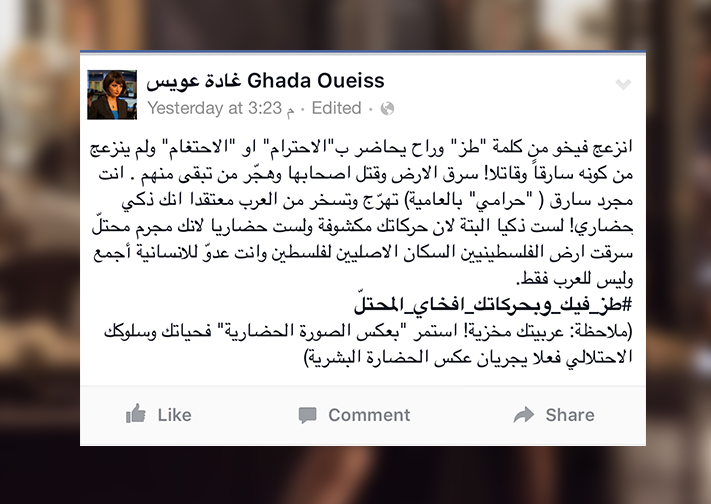 ودخلت المذيعة بقناة "الجزيرة" غادة عويس في جدال شديد مع أدرعي عبر صفحتيهما الرسمية على فيسبوك، وذلك بعد إطلاقها "هاشتاغ" ضده، ردًا على نشره فيديو التهنئة بشهر رمضان على حسابه.