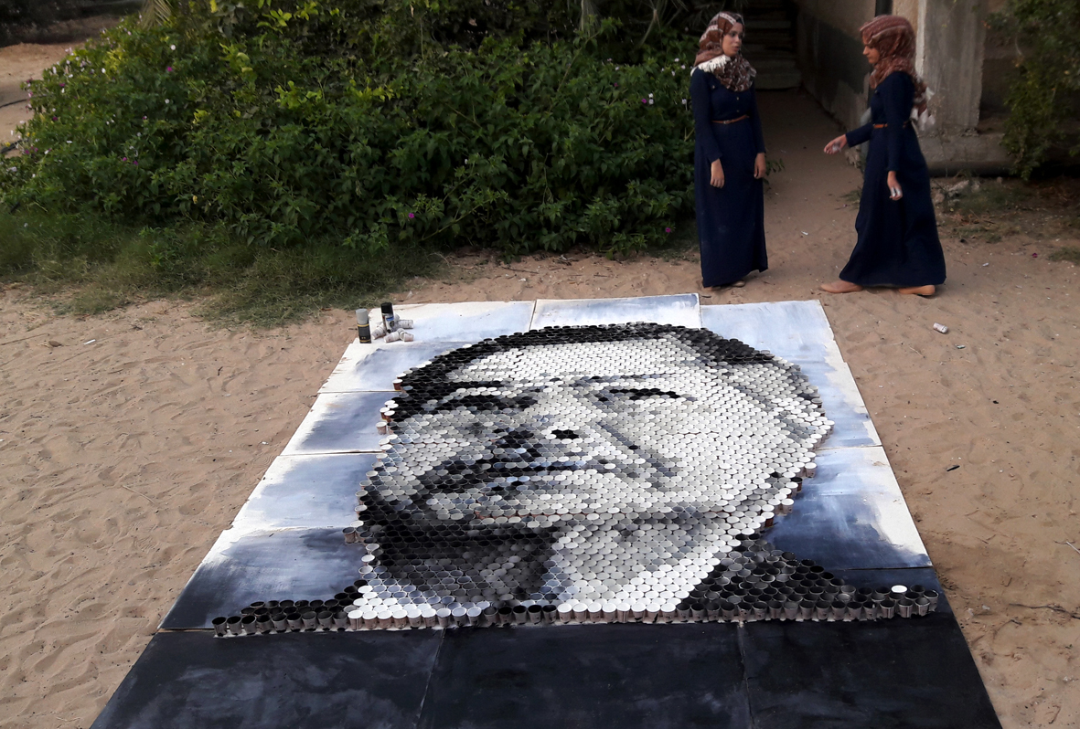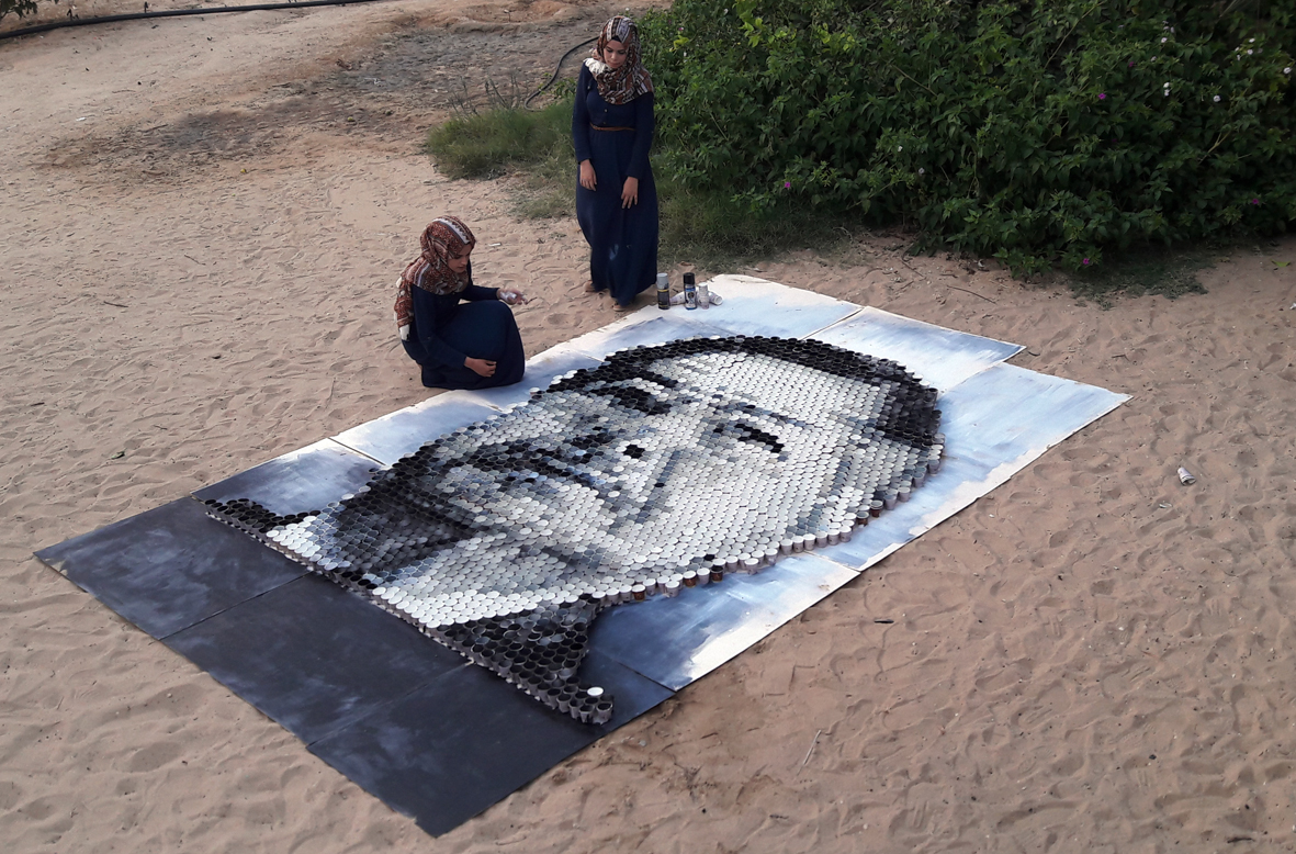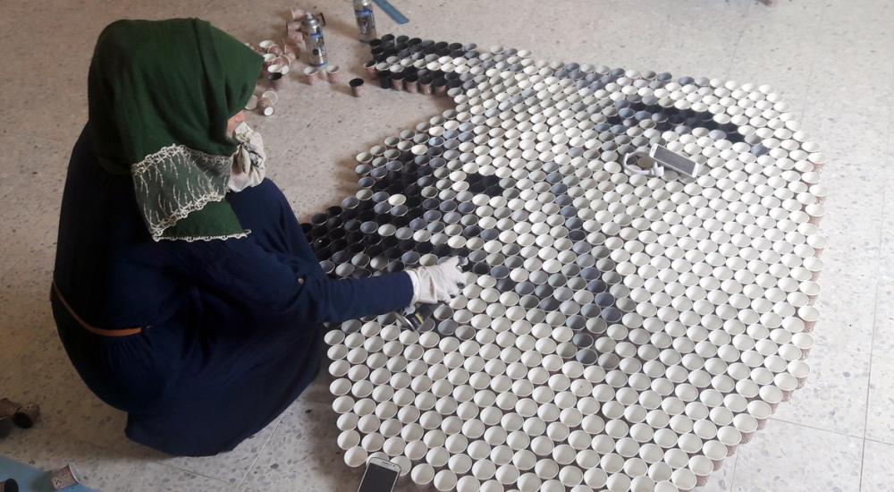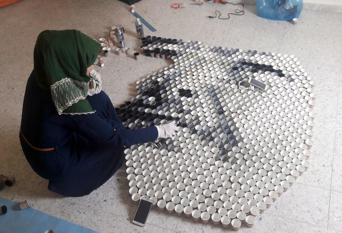 تمكنت فنانتان تشكيليتان من محافظة خان يونس جنوبي قطاع غزة، من رسم لوحة فنية كبيرة تزيد عن "3أمتار"، من الأكواب الكارتونية التي تستخدم في احتساء المشروبات الساخنة، في مبادرة تُعد الأولى من نوعها على مستوى فلسطين.
