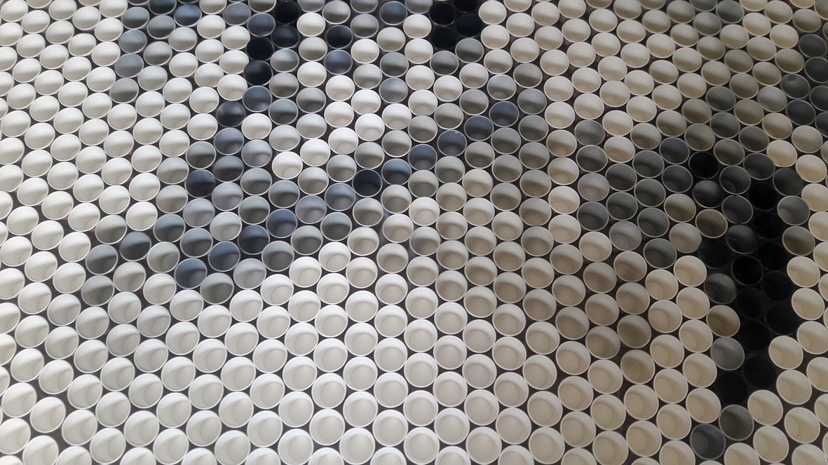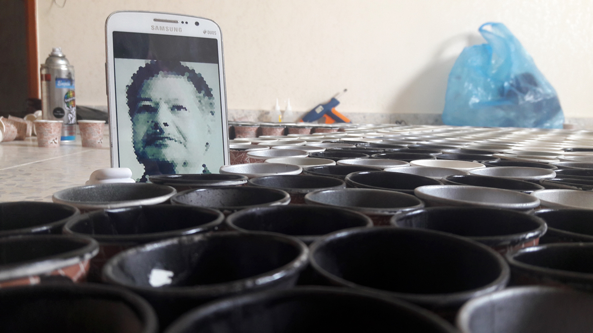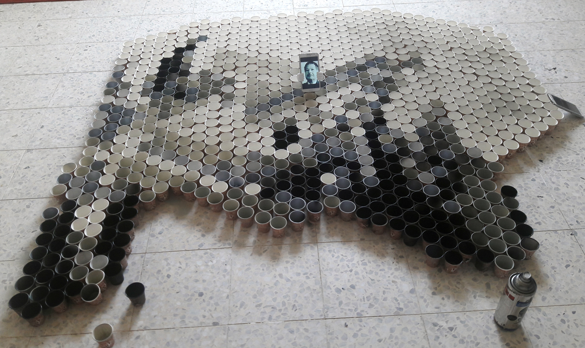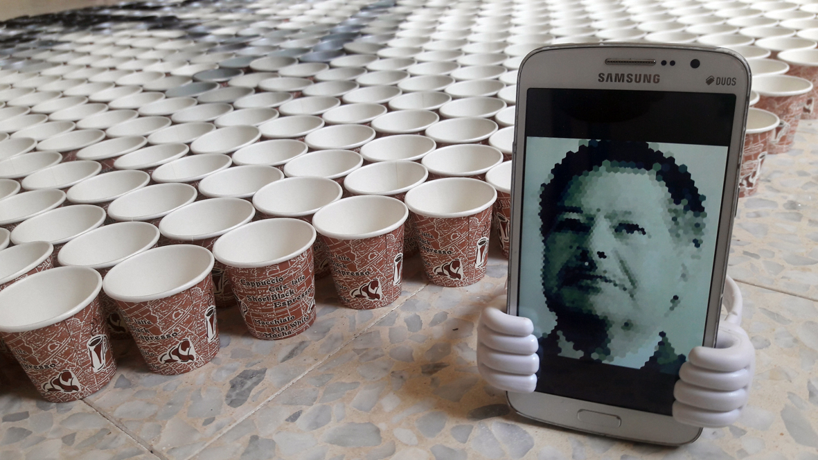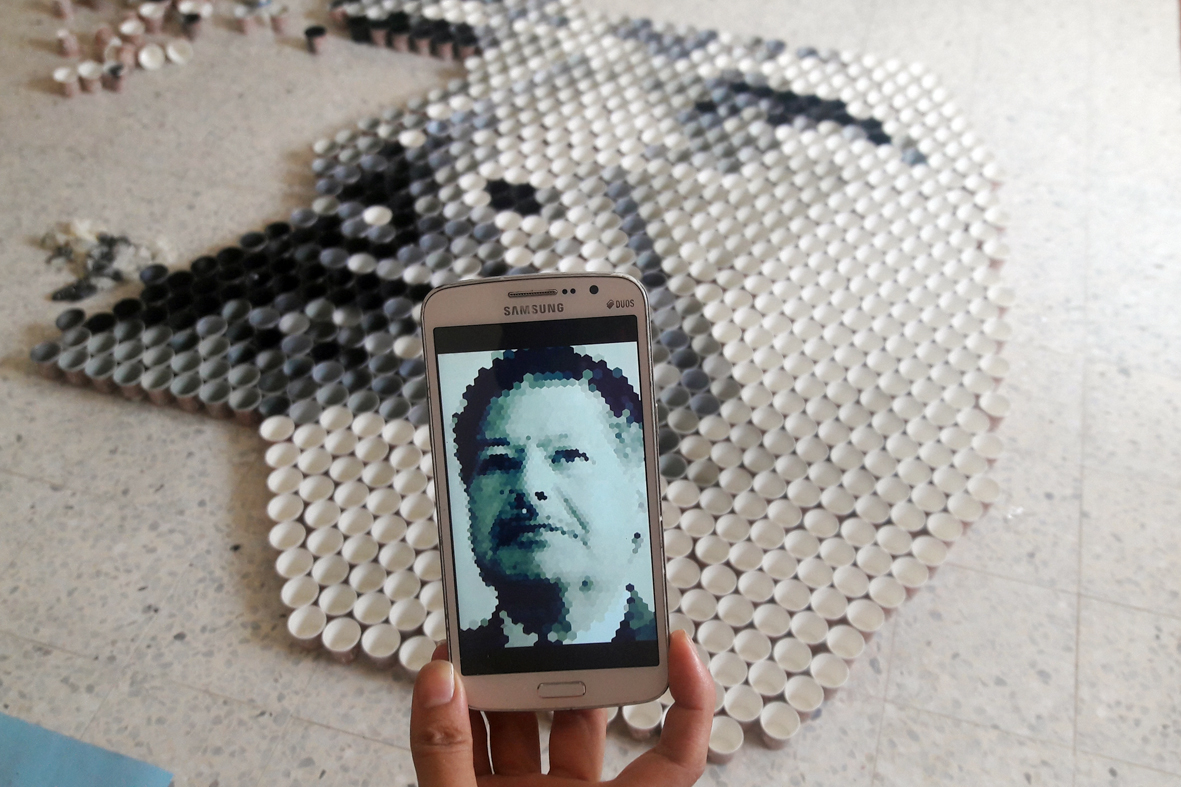 تلا ذلك تلوين عدد من الأكواب بما يتناسب مع اللون في الصورة التي وضعت داخل جهاز لوحي "أيباد"، ومن ثم وضع كل كوب من نفس اللون بجوار نظيره، وهكذا، حتى اكتمال تدرج الألوان، "ظل ونور" لتكتمل ملامح الوجه.