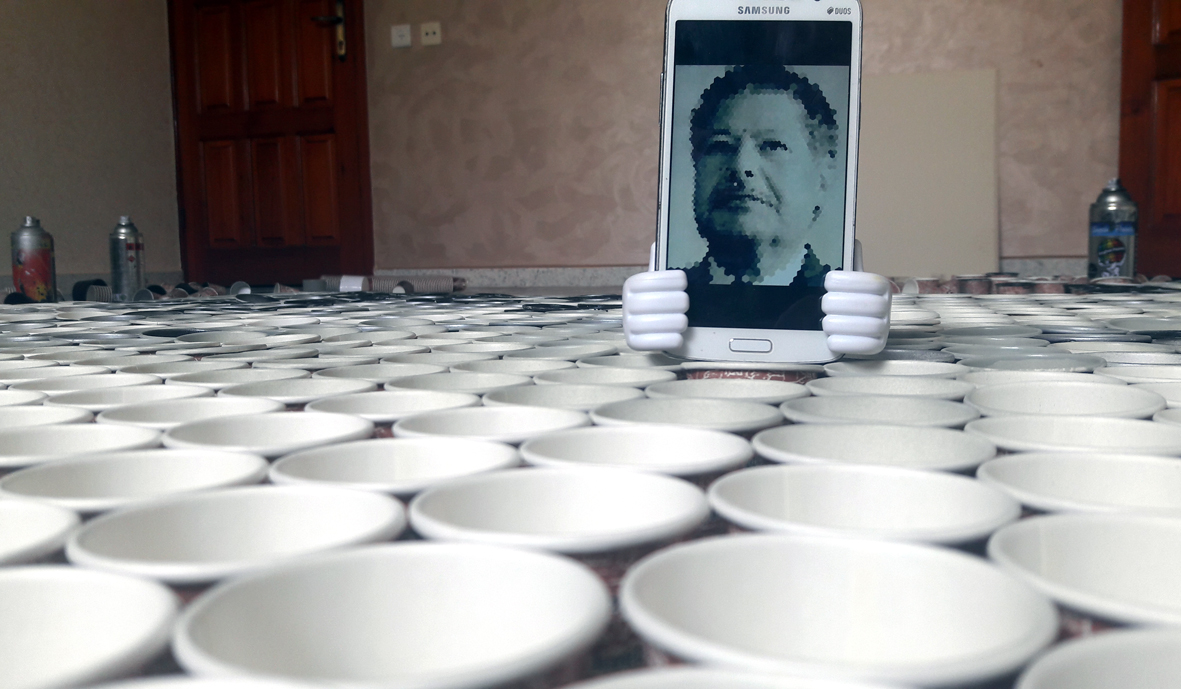 تبدأ فكرة العمل في اللوحة، كما تقول الفنانة التشكيلية إلهام الأسطل لمراسل "صفا"، بإدخال صورة الشخص المراد رسمه لبرنامج "فوتوشوب" وبعدها إلى "بكسل"؛ تم البدء بعد ذلك بوضع الأكواب بجوار بعضها بشكل مُعقد، لضبط دراجات اللون من الأسود ثم الرمادي حتى الأبيض، كما في الصورة.
