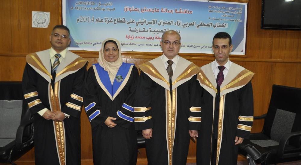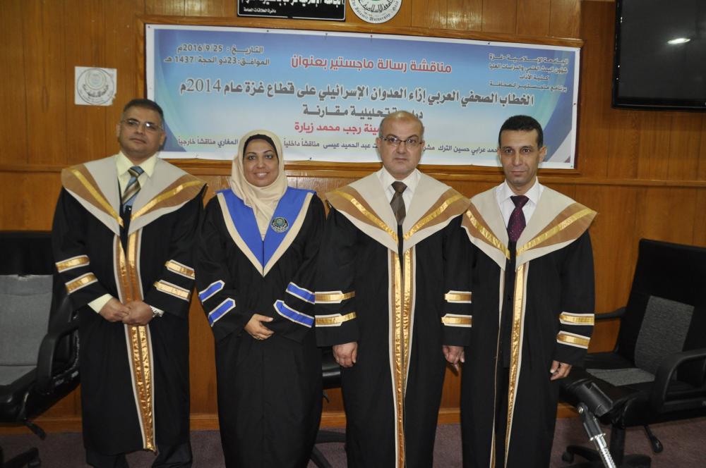 منحت الجامعة الإسلامية بغزة درجة الماجستير للزميلة أمينة رجب زيارة بعد مناقشة رسالتها في الصحافة والإعلام والتي حملت عنوان "الخطاب الصحفي العربي إزاء العدوان الإسرائيلي على قطاع غزة عان 2014م".