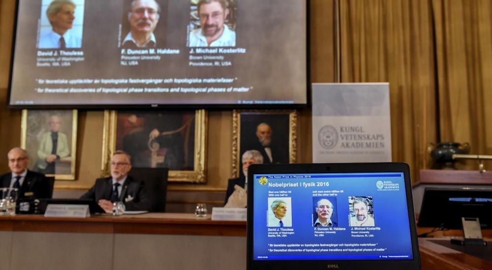 منحت جائزة نوبل في الفيزياء لثلاثة بريطانيين وهم"ديفيد ثاوليث أستاذ الفيزياء بجامعة واشنطن، والذي حصل على نصف قيمة الجائزة وتقاسمها مناصفة بين دانكن هولداين أستاذ الفيزياء بجامعة برينستون الأمريكية، ومايكل كوسيرلتز أستاذ الفيزياء بجامعة براون الأمريكية".
