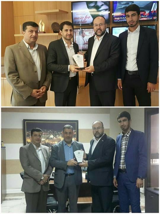 والتقى الوفد خلال زيارته مديري القناتين مازن إبراهيم وهيثم منيب، وقدموا خلالها درعًا تكريميًا لكل من القناتين.