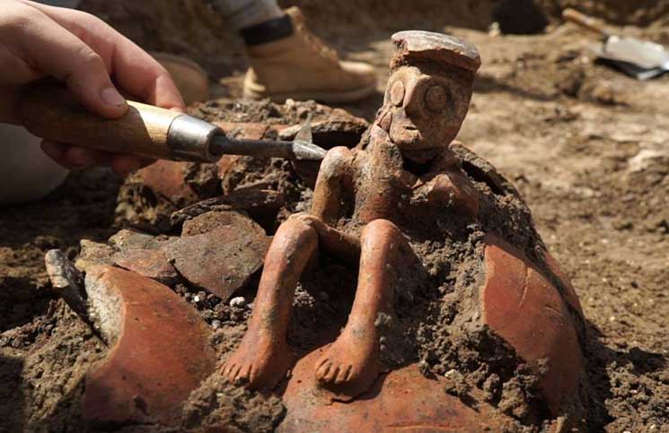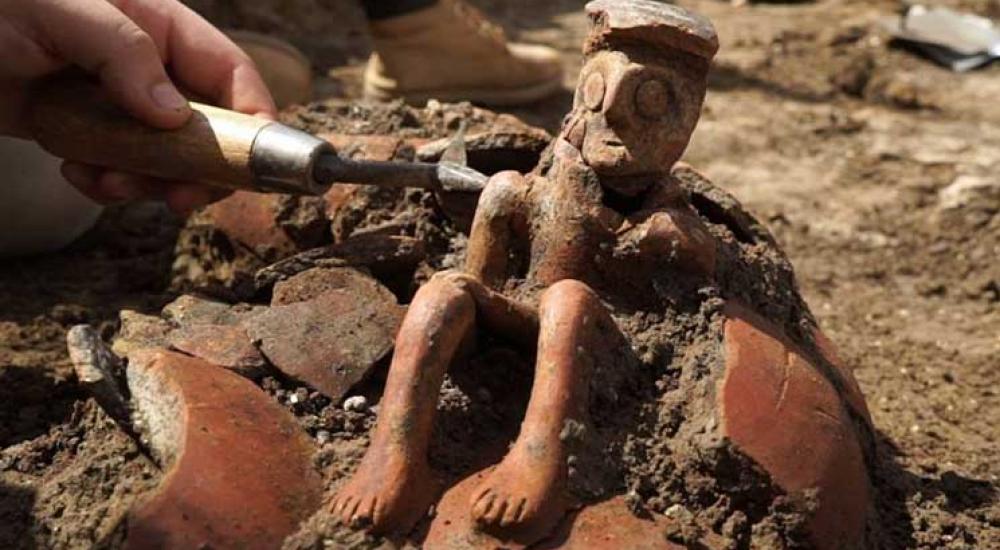 وتم العثور على المكتشفات الأثرية من الفترة البرونزية الوسطى داخل جرة مصنوعة من الفخار فيها منحوتة لرجل، طولها 18 سنتيمترًا، ولم يعثر على ما يشبهها حتى الآن، وتمتاز بدقة صناعتها.