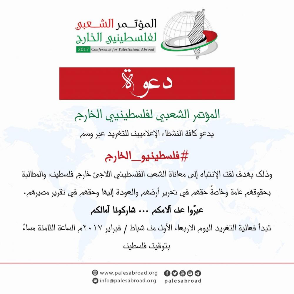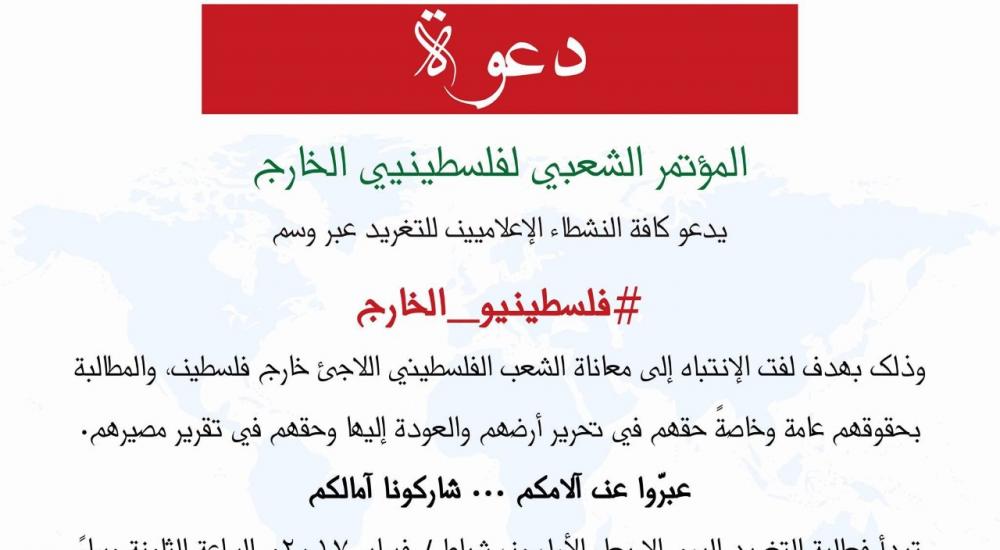 دعا المؤتمر الشعبي لفلسطينيي الخارج كافة النشطاء والإعلاميين إلى المشاركة مساء اليوم الأربعاء في التغريد عبر وسم #فلسطينيو_الخارج بهدف لفت الانتباه إلى معاناة الشعب الفلسطيني اللاجئ خارج فلسطين.