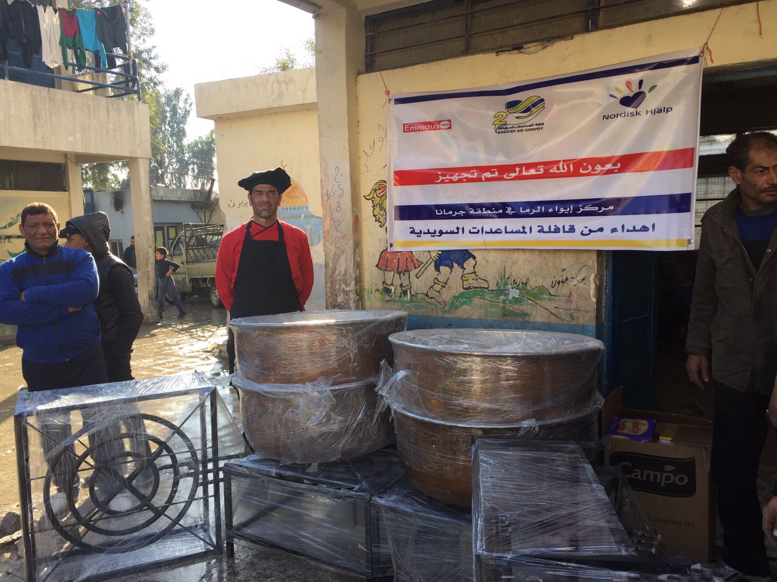 وافتتح وفد القافلة مطبخًا في مخيم جرمانا للاجئين الفلسطينيين قرب دمشق، سيقدم الطعام مجانًا لهم بالتعاون مع وكالة الغوث "أونروا"، إضافة لتوزيعه الألعاب على الأطفال.