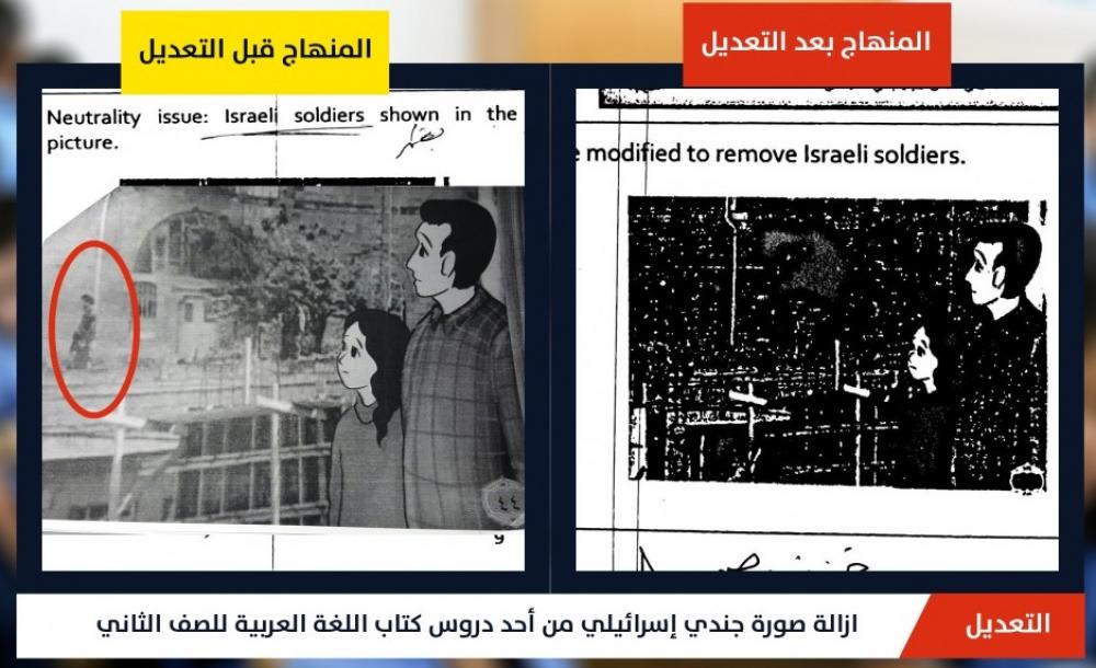 وأشارت إلى إزالة لصورة جندي إسرائيلي مدجج بالسلاح كتعبير عن الاحتلال، وإزالة صورة لجدار الفصل العنصري، وتشويه قضية اللاجئين بالادعاء أن الشعب الفلسطيني فرّ من دياره دون الإشارة إلى المجازر وعمليات الطرد المنظم التي قامت بها العصابات الصهيونية، وغيرها من التعديلات، وفق البيان.