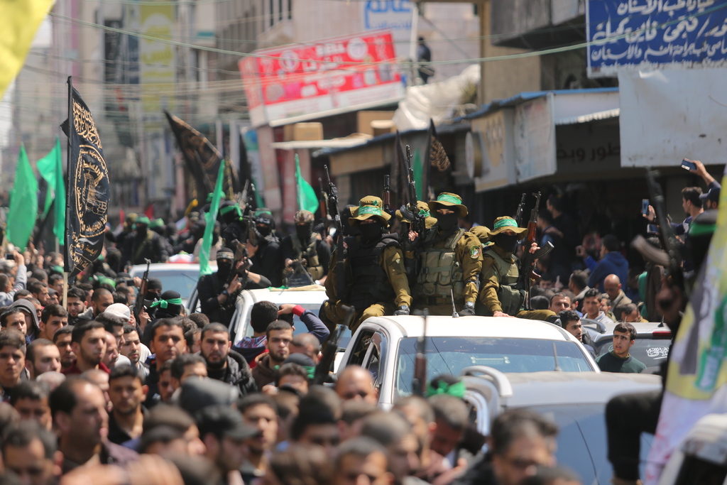 عناصر من القسام خلال تشييع الشهيد مازن فقها بغزة