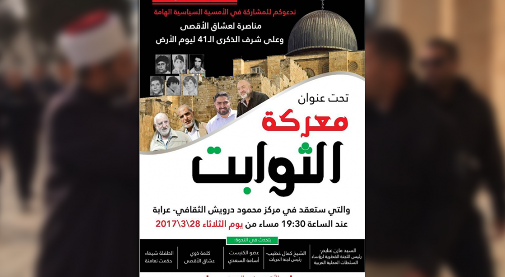 واعتبر "أن عنوان الأمسية المزامن مع هذه المناسبات، يؤكد أن الأرض من الثوابت والمقدسات من الثوابت وفي مقدمتها المسجد الأقصى المبارك، ونتمنى أن يتردد صدى هذه الأمسية وعنوانها في كل الداخل الفلسطيني".
