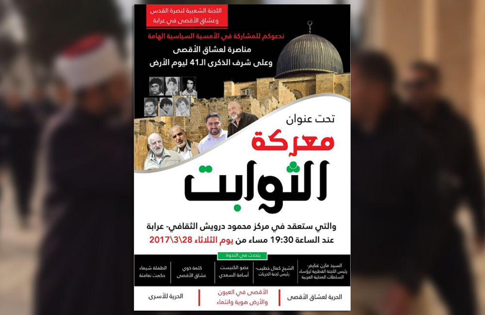 تنظّم "اللجنة الشعبية لنصرة القدس وعشاق الأقصى" في مدينة عرابة الثلاثاء، أمسية سياسية بعنوان "معركة الثوابت" وذلك مناصرة للمعتقلين والملاحقين إسرائيليًا، بسبب مناصرتهم لقضية القدس والمسجد الأقصى المباركين وما بات يعرف بـ "عشاق الأقصى"، كذلك تنظم الأمسية لمناسبة الذكرى الـ 41 ليوم الأرض الخالد والتي توافق يوم الخميس القادم.