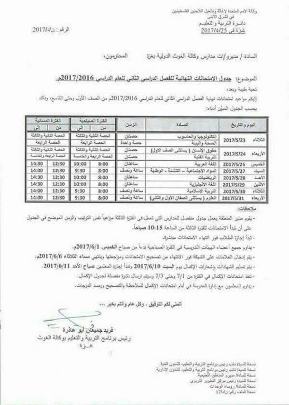 وقال مدير التعليم في وكالة الغوث بغزة فريد أبو عاذرة في تصريح لوكالة "صفا": "إن إدارة الوكالة ستجتمع اليوم مع مدراء المديريات في كافة محافظات القطاع، لمناقشة تعديل الجدول، وسيتم إعادة النظر في ترتيب الجدول وليس موعد انطلاق الامتحانات".