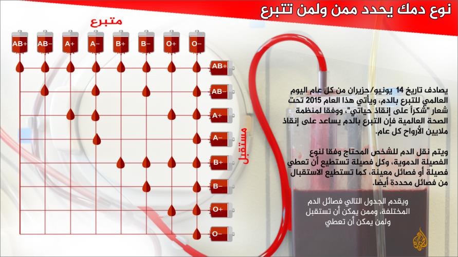 وبناء على نوع دمك، فإن نوع الدم الذي يمكن نقله لك هو التالي: