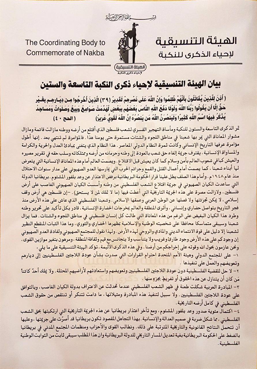 وفي كلمة الهيئة التنسيقية أكد رئيس دائرة شئون اللاجئين في حماس عصام عدوان أن على المجتمع الدولي وهيئة الأمم المتحدة تنفيذ ما اتُخذ من قرارات صدرت بشأن عودة اللاجئين الفلسطينيين إلى ديارهم وتعويضهم.