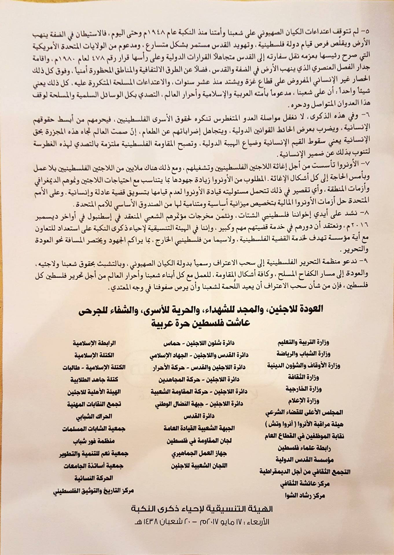 ودعا منظمة التحرير إلى سحب اعترافها بالكيان الإسرائيلي والتشبث بحقوق شعبنا ولاجئيه والعودة إلى مسار الكفاح المسلح وكافة أشكال المقاومة للعمل مع كل أبناء شعبنا وأحرار العالم من أجل تحرير فلسطين كل فلسطين.