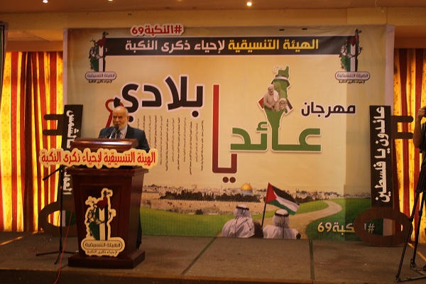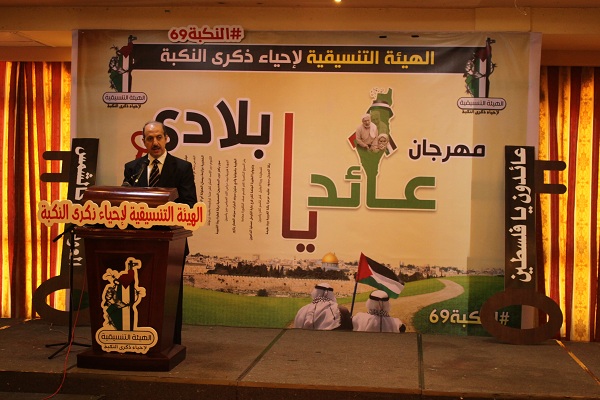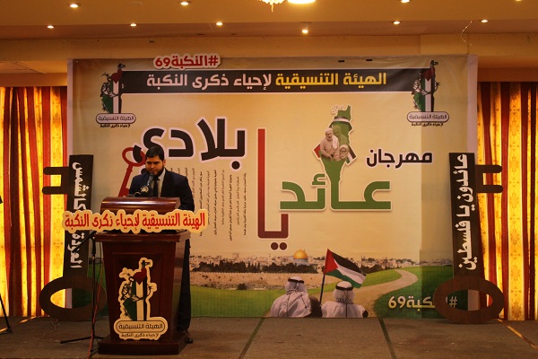 عقدت الهيئة التنسيقية لإحياء الذكرى السنوية الـ 69 للنكبة الأربعاء مهرجانا شعبياً في غزة تحت شعار "عائد يا بلادي".