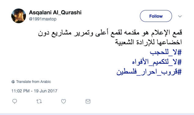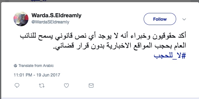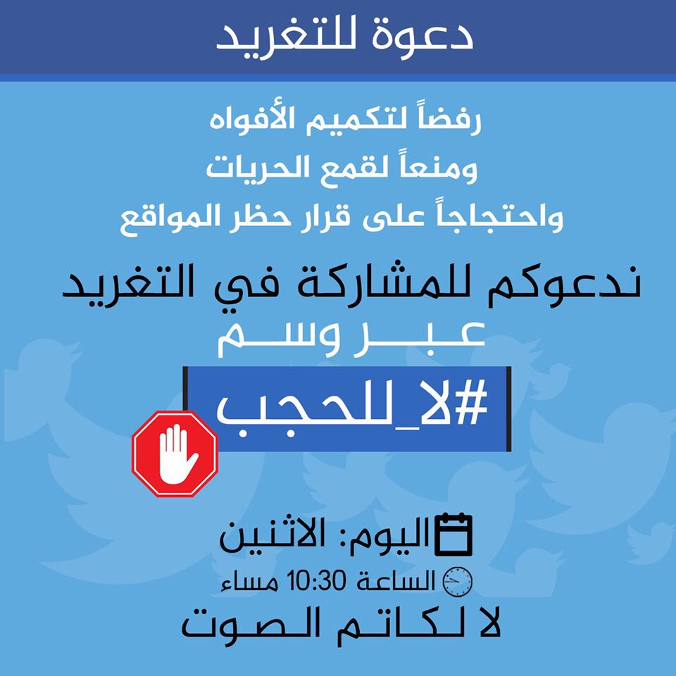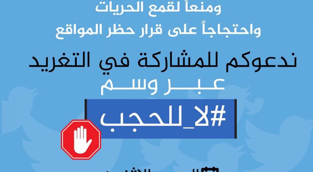 ودعا نشطاء للتغريد على وسم #لا+للحجب للتعبير عن رفض هذه الإجراءات التعسفية بحق المواقع والصحف والوكالات الإخبارية، ابتداءاً من الساعة العاشرة والنصف مساء اليوم.