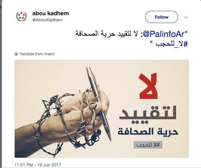 انطلقت مساء اليوم حملة على مواقع التواصل الاجتماعي ومنصات الإعلام الجديد تضامنا مع المواقع والوكالات التي أصدرت السلطة الفلسطينية مؤخراً قراراً بحجبها عن الشبكة العنكبوتية، بطريقة غير قانونية وتخترق قواعد حرية الإعلام والتعبير.