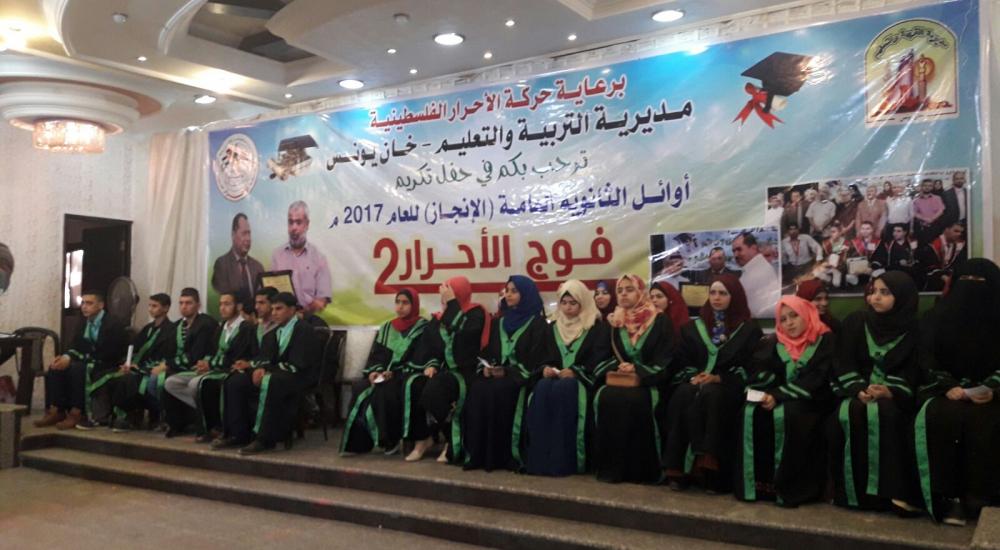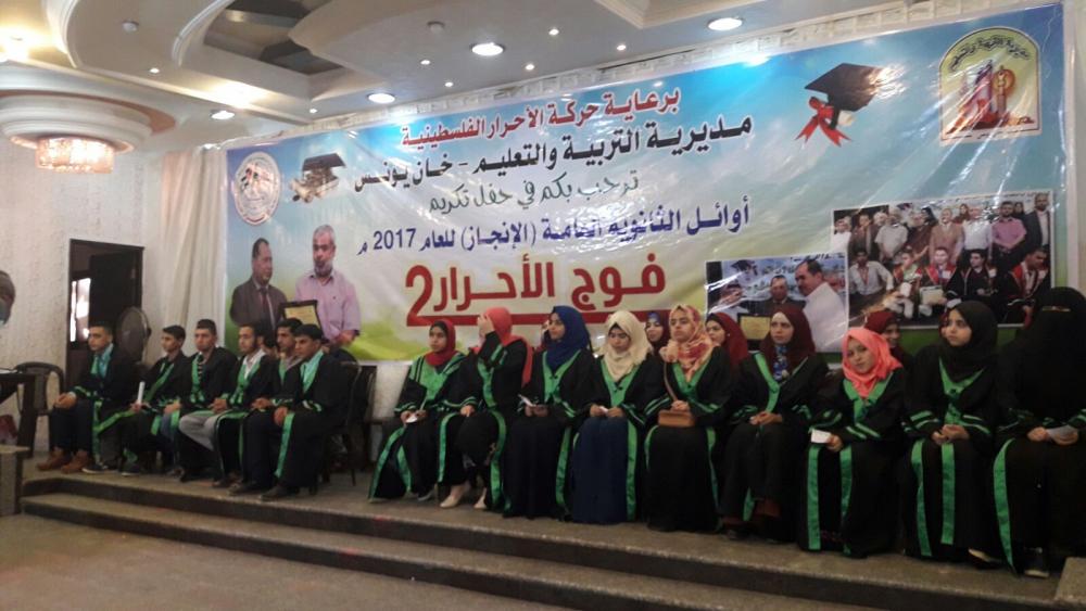 نظمت حركة الأحرار الفلسطينية ومديرية التربية والتعليم في محافظة خانيونس جنوب قطاع غزة حفل تكريم لأوائل الطلبة في الثانوية العامة وذلك في صالة "رويال بالاس" في خانيونس.