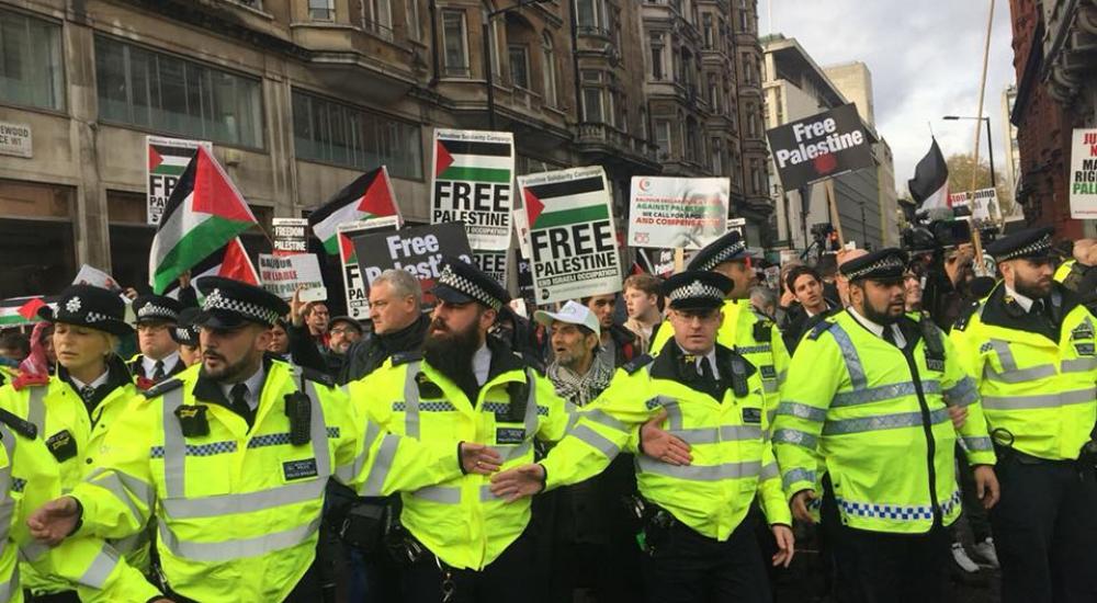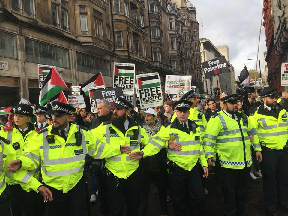 شارك أكثر من خمسة آلاف شخص بمسيرة وسط العاصمة البريطانية لندن ضد "وعد بلفور"، واحتجاجًا على زيارة رئيس الوزراء الإسرائيلي بنيامين نتنياهو الذي زار لندن يوم الخميس للاحتفال بذكرى مرور 100 عام على وعد بلفور.