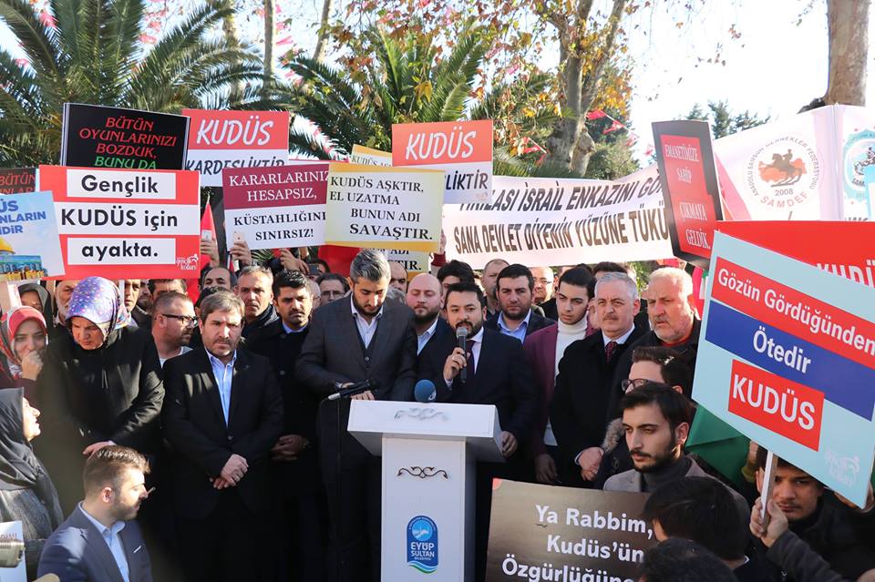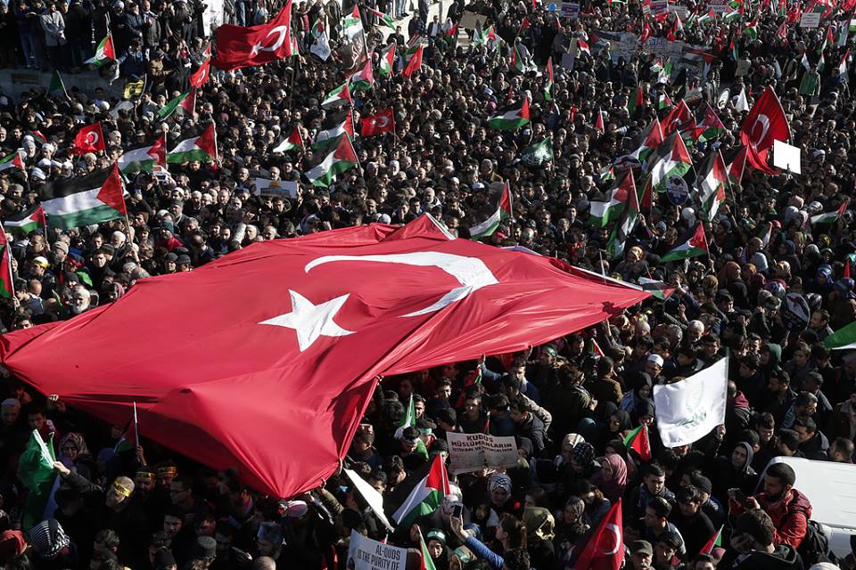وتظاهر عشرات آلاف الأتراك في مدن تركية مختلفة، وخرجوا بمظاهرات في الميادين العامة، ورفعوا الأعلام التركية والفلسطينية، فضلًا عن ترديد هتافات منددة بالولايات المتحدة و"إسرائيل".
