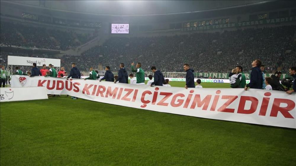 ودخل لاعبو الفرق التركية الملاعب قبل انطلاق مبارياتهم اليوم السبت وأمس الجمعة رافعين لافتات كتب عليها "القدس خط أحمر".