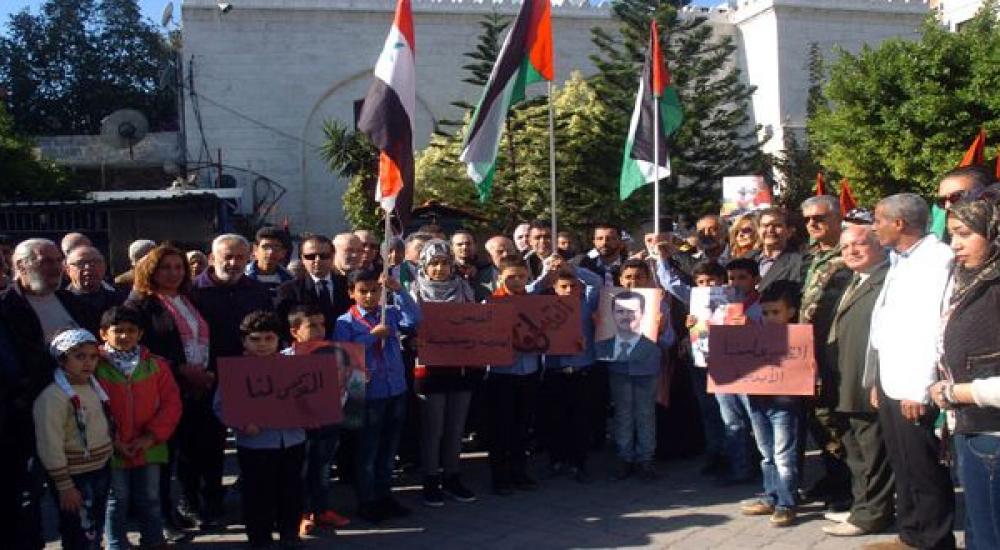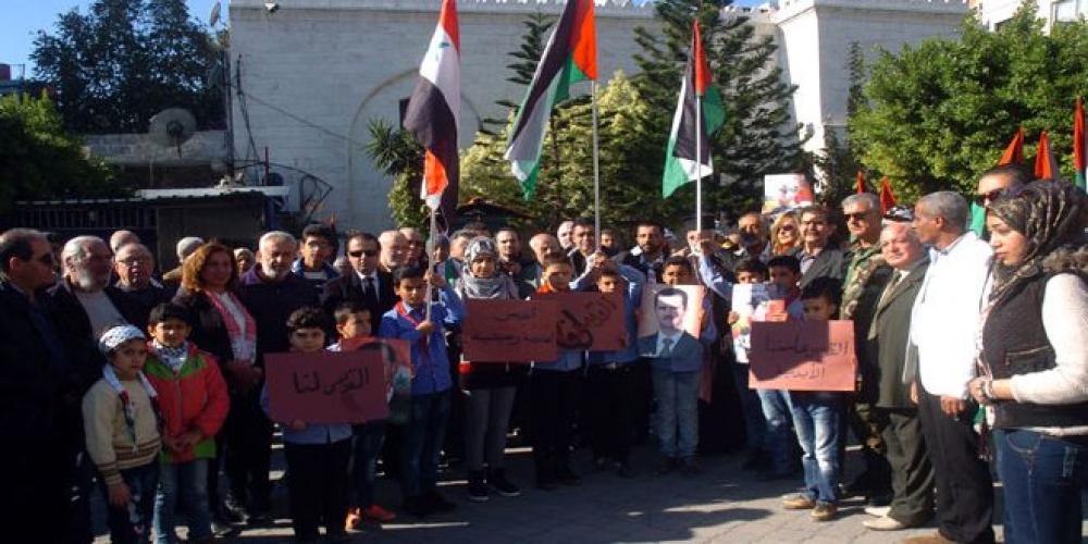 وأكد المشاركون في الوقفة الاحتجاجية والذين رددوا الهتافات المنددة بالقرار وحملوا الأعلام السورية والفلسطينية واللافتات المؤكدة على عروبة القدس أن هذا القرار يشكل خدمة كبرى للمشروع الصهيوني واعتداء سافرا على حقوق الشعب الفلسطيني وعلى المقدسات الاسلامية والمسيحية.