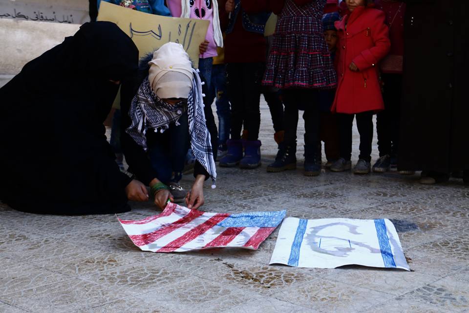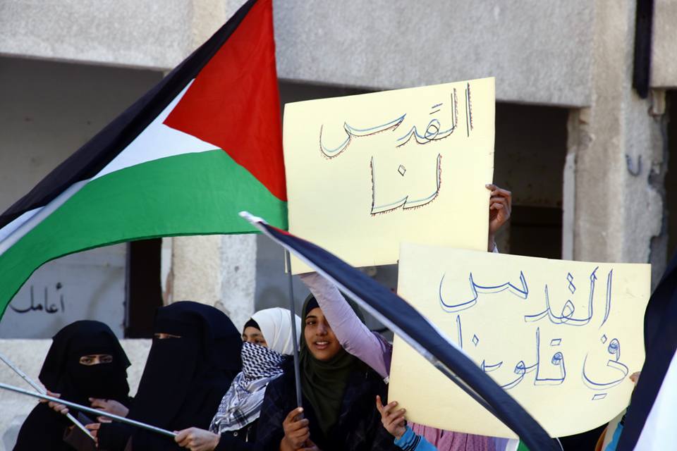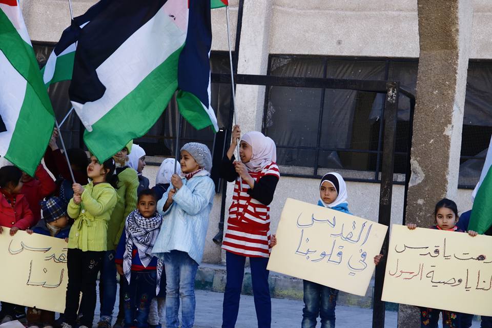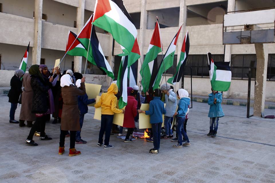 وكان أبناء مخيم اليرموك للاجئين الفلسطينيين والمتواجدين في بلدة يلدا وطلاب مدرسة الجرمق البديلة وكادرها التدريسي خرجوا بتظاهرة رداً على قرار ترمب ونقل سفارة بلاده إلى القدس.