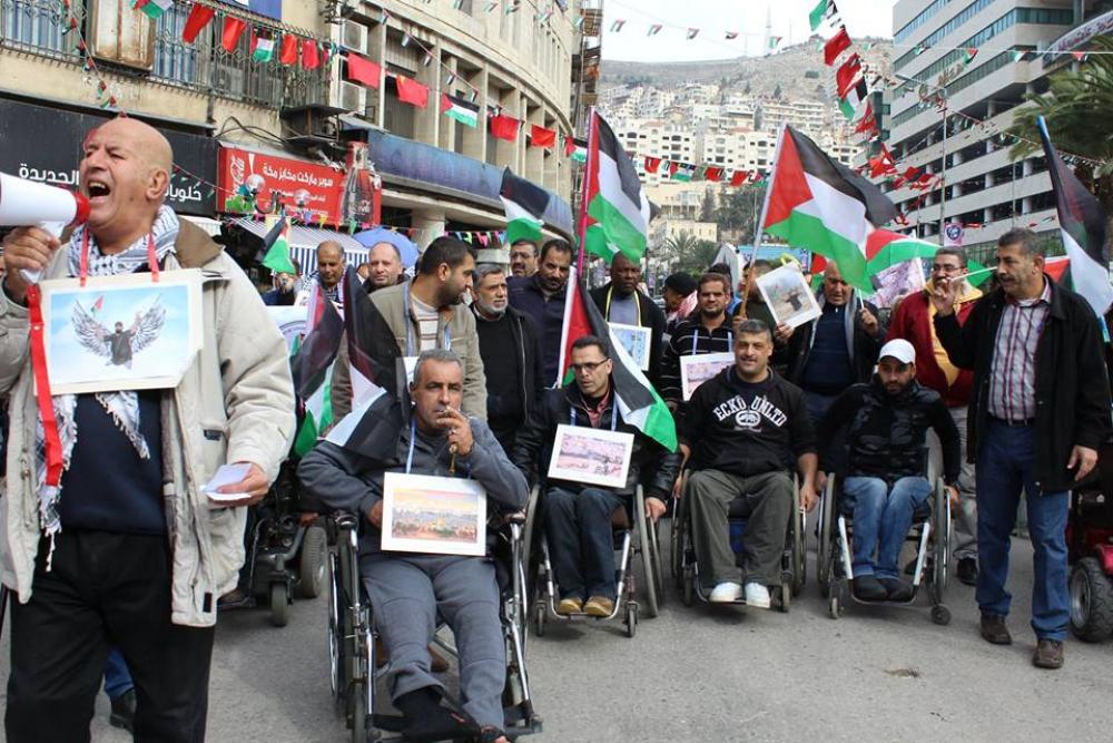 نظم الاتحاد العام للأشخاص ذوي الإعاقة ولجنة التنسيق الفصائلي بمحافظة نابلس شمال الضفة الغربية المحتلة يوم الخميس مسيرة احتجاج ضد قرار الرئيس الأمريكي دونالد ترمب اعتبار مدينة القدس المحتلة "عاصمة لإسرائيل"، وجريمة إعدام الجريح إبراهيم أبو ثريا بدم بارد.