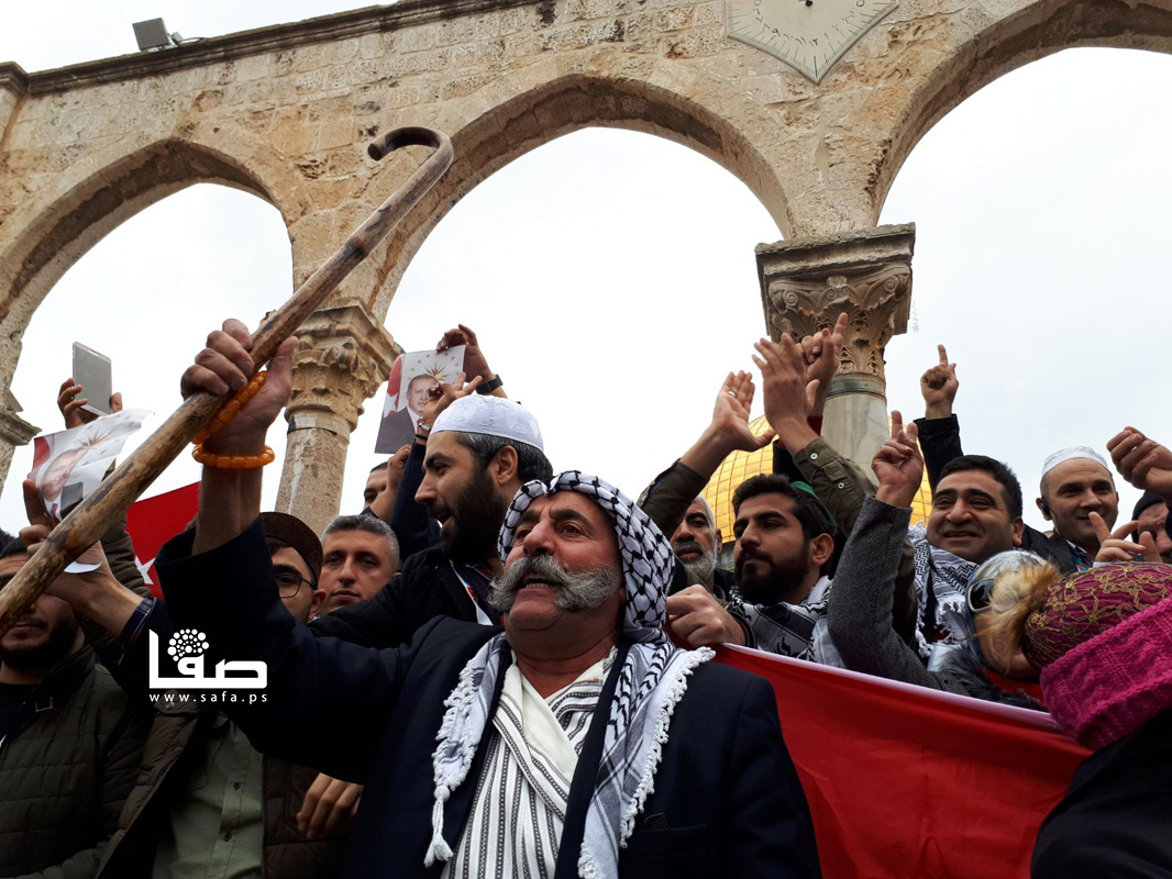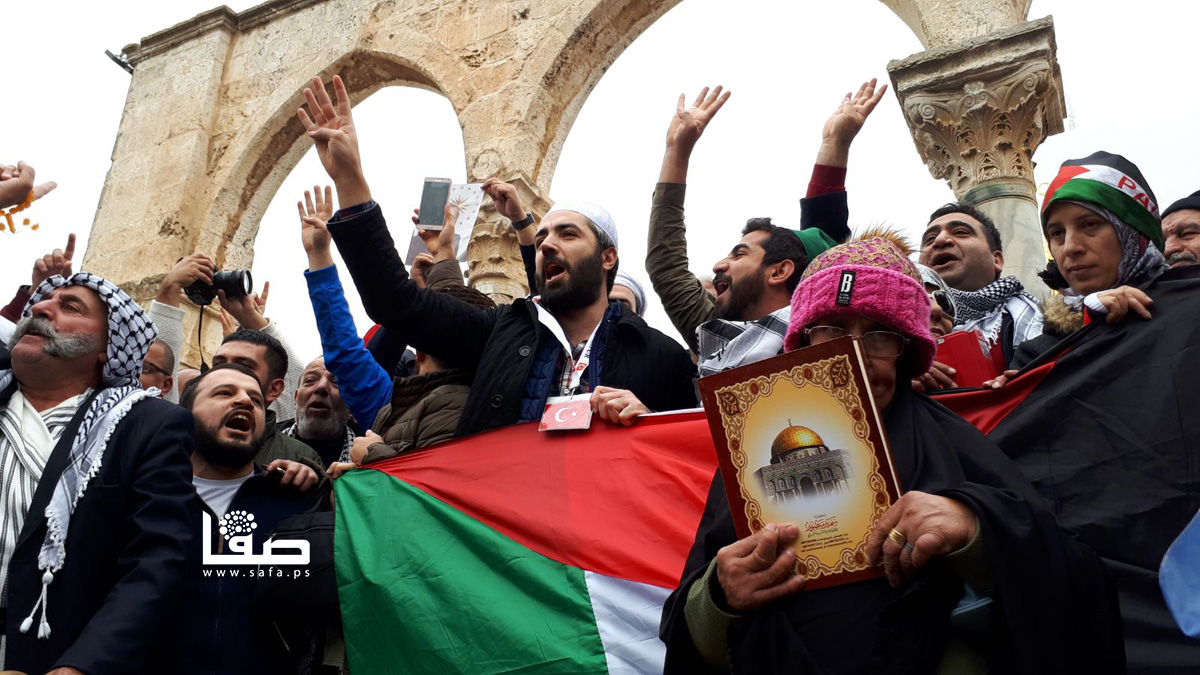 وشارك العشرات من المصلين في وقفة احتجاجية بين مسجدي قبة الصخرة والقبلي، رددوا خلالها الهتافات المنددة بقرار ترمب اعتبار مدينة القدس "عاصمة لإسرائيل"، ورفعوا الأعلام الفلسطينية والتركية والمصحف.