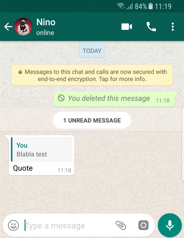 اكتشفت بعض المصادر في المحادثات الجماعية أنه عندما تحذف رسالة ما وتم اقتباسها للرد عليها، فإنها تحذف بشكلها التقليدي لكنها تظهر بشكل واضح في الاقتباس.