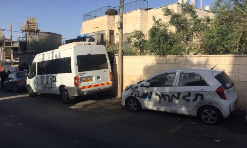 وبحسب المعلومات المتوفرة، تم في ساعات الفجر إضرام النيران بمركبتين وكتابة شعارات تحريضية وعنصرية "أيها اليهود تعالوا لننتصر".