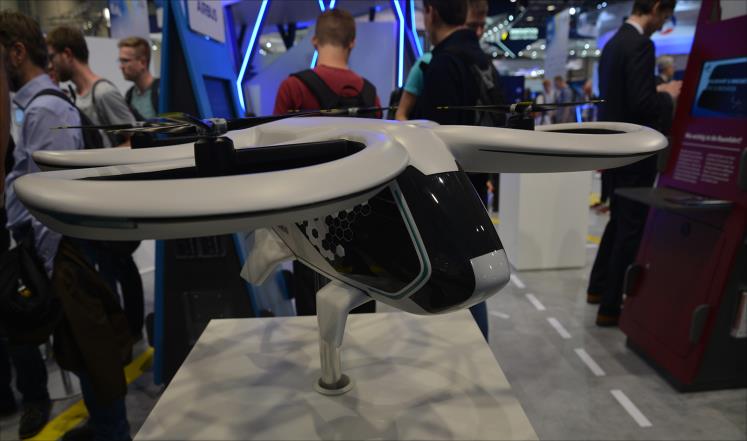 بعكس ما يبدو لأول وهلة كلعبة أطفال غالية الثمن، يقدم نموذج التاكسي الطائر داخل معرض برلين الدولي للطيران والفضاء فكرة عن المنافسة الدائرة حاليا بين كبريات شركات الصناعة والتقنية العالمية حول مشروعات النقل غير التقليدية داخل المدن العالمية الكبرى مستقبلا.