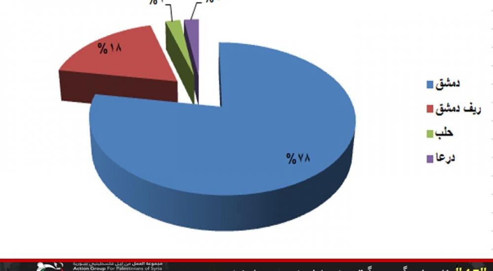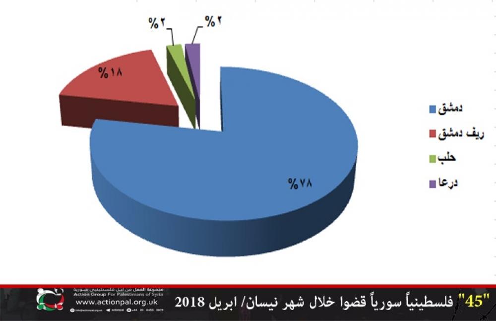 وأشارت إلى أن الضحايا الفلسطينيين الذين قضوا خلال شهر نيسان - ابريل 2018، توزعوا حسب المناطق في سورية على النحو التالي: (35) شخصاً قضوا في دمشق، و(8) آخرين في ريف دمشق، ولاجئ في حلب، وشخص توفي في درعا.