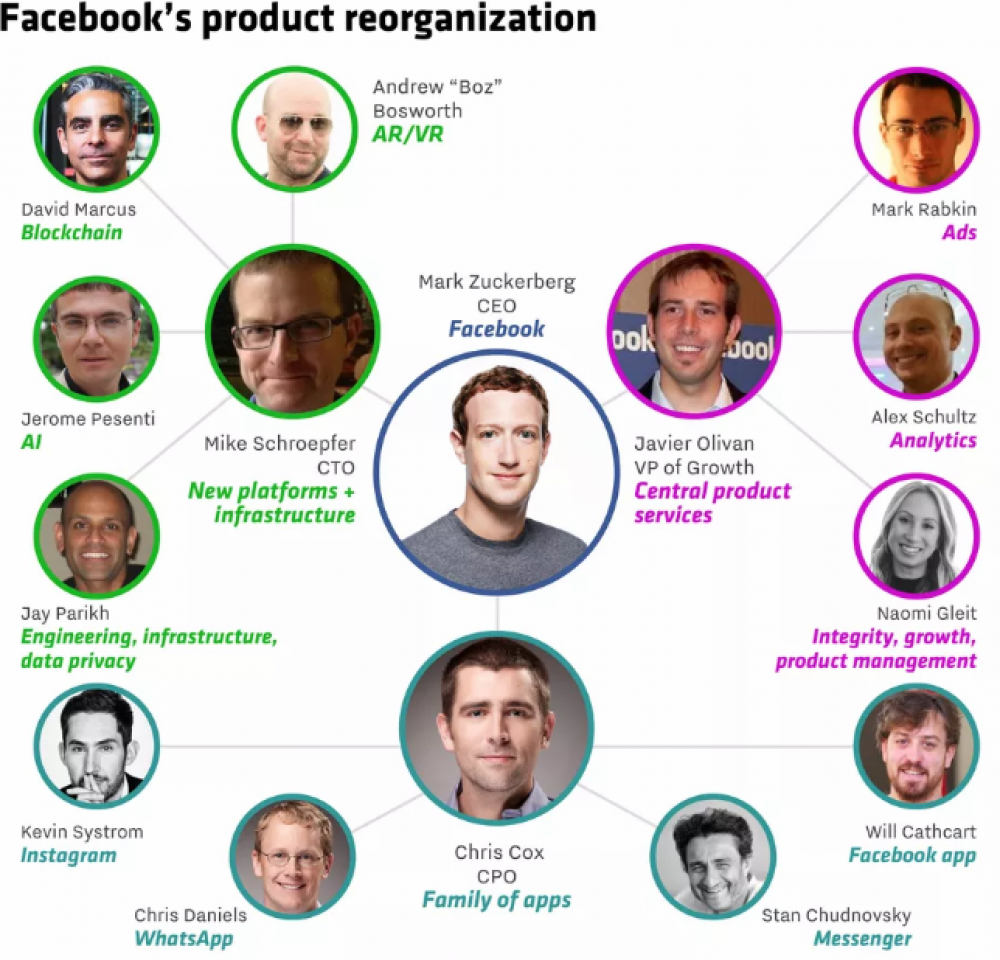 أجرت شركة فيس بوك تغييرات إدارية على المستوى الأعلى، إذ عيّنت مدراء جدد لتطبيقات واتساب ومسنجر وتطبيقها الرئيسي للشبكة الاجتماعية، كما أسست قسم جديد مختص بتقنية البلوكتشين وعينت عليه مدير مسنجر السابق.