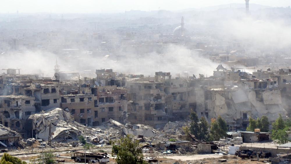 وفي السياق، جددت قوات النظام السوري قصفها على مخيم اليرموك للاجئين الفلسطينيين مما خلف دماراً وخراباً في منازل المدنيين، كما أظهرت صوراً بثها أبناء المخيم تظهر الدمار الذي أصاب مسجد فلسطين وقبته بسبب الاستهداف المتكرر للمنطقة.