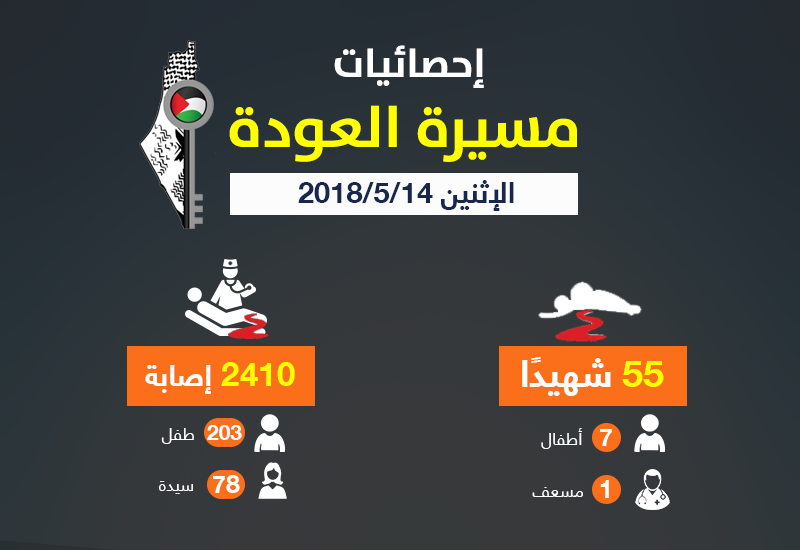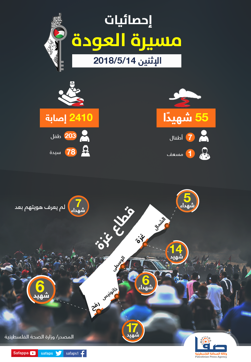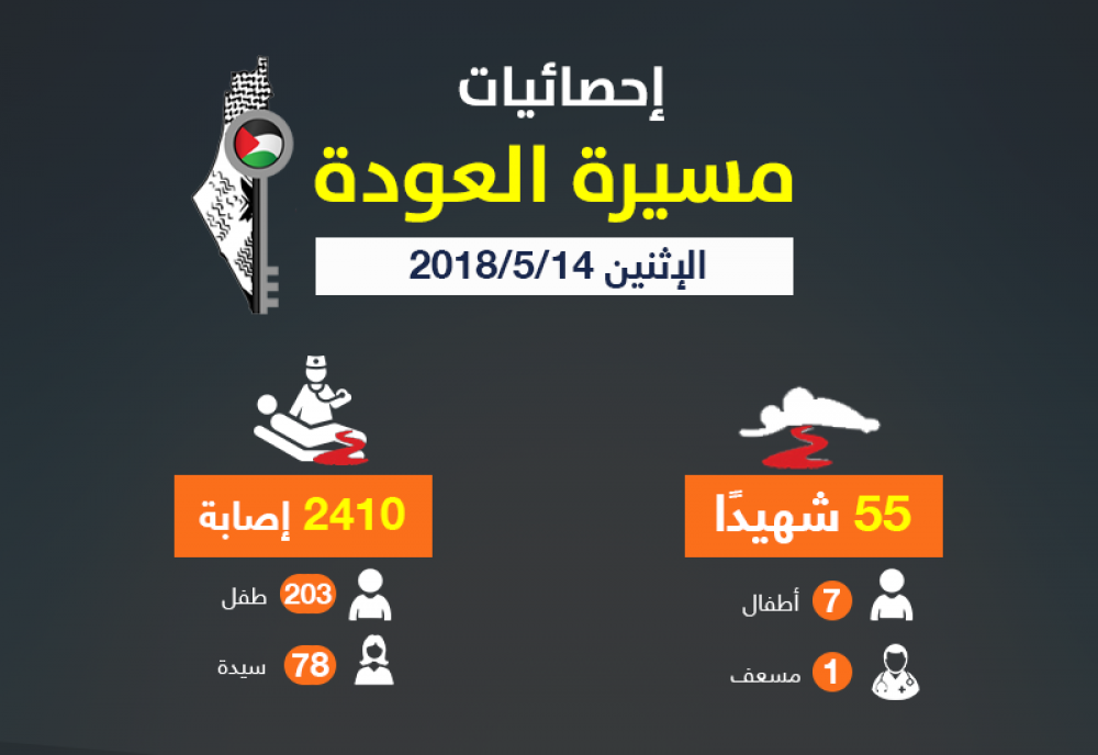 أعلنت وزارة الصحة في قطاع غزة مساء اليوم الاثنين عن استشهاد 55 فلسطينيا وإصابة 2771 آخرين بجراح في مليونية العودة في القطاع اليوم.