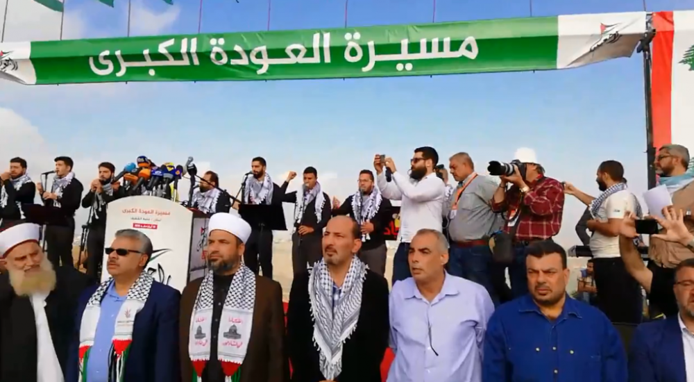 ووسط انتشار أمني كثيف للقوى الأمنية اللبنانية تجمع هؤلاء بدعوة من القوى الوطنية للمشاركة في "مسيرة العودة" هاتفين للقدس وغزة على وقع الأغاني الوطنية المنادية بحق العودة.