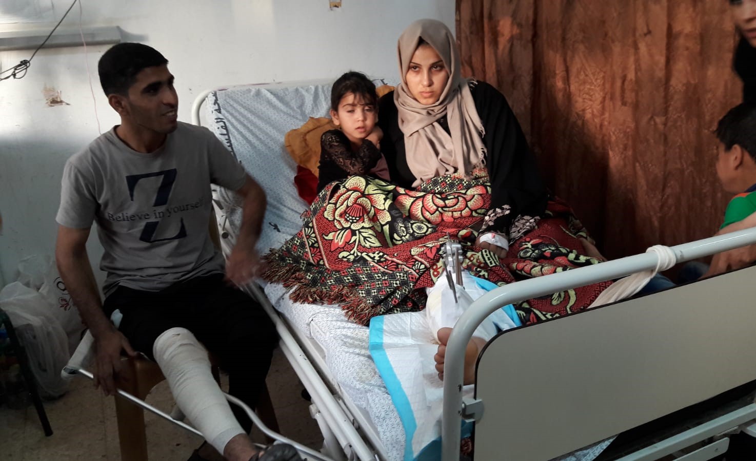 على سرير بالمشفى الأوروبي بخان يونس، ترقد أسماء ويحيط بها طفليها عمر أبو دقة (7 أعوام) وليان (5 أعوام) اللذان لن يتمتعا لفترة طويلة بجولة على الأقدام برفقتها؛ فيما يجلس زوجها المصاب على كرسي بالقرب منها.