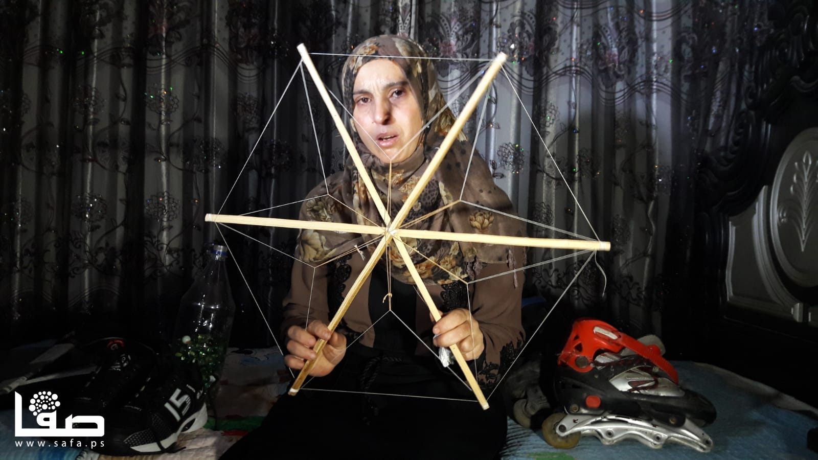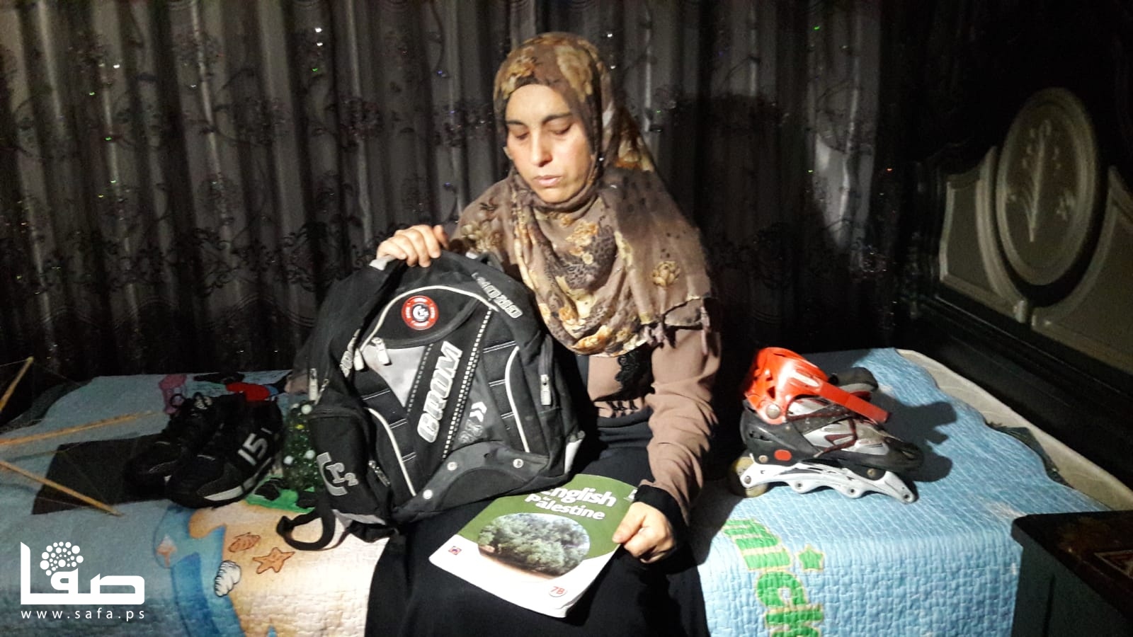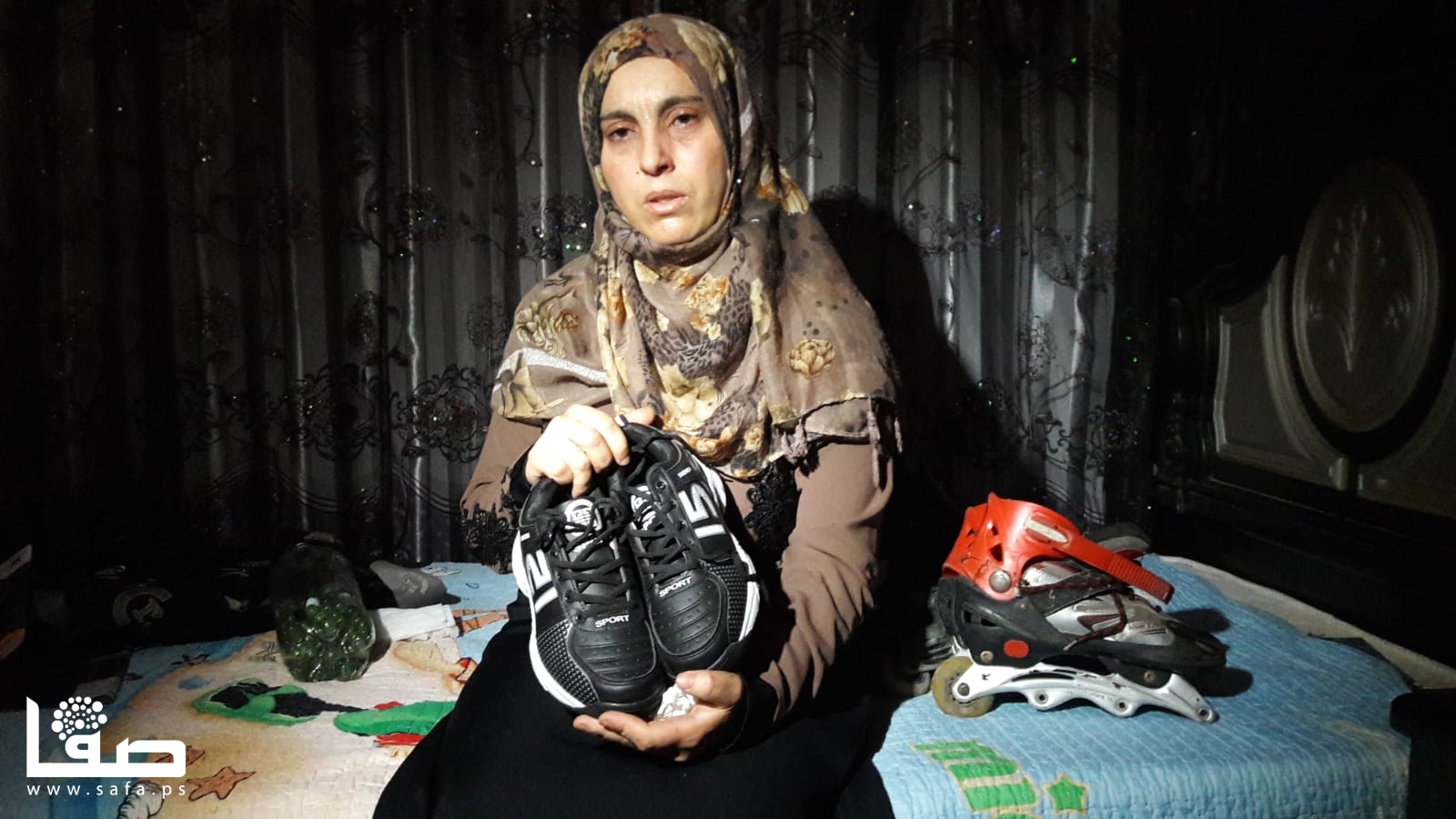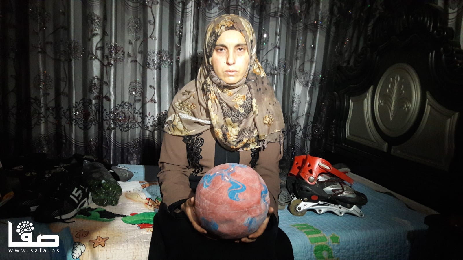 التقينا والدته التي أصرت على جلب كرة قدم كانت تسلية نجلها ولكل جيرانه، مع قميصٍ لنادٍ إسباني شهير ومزلاجان بعجلات.